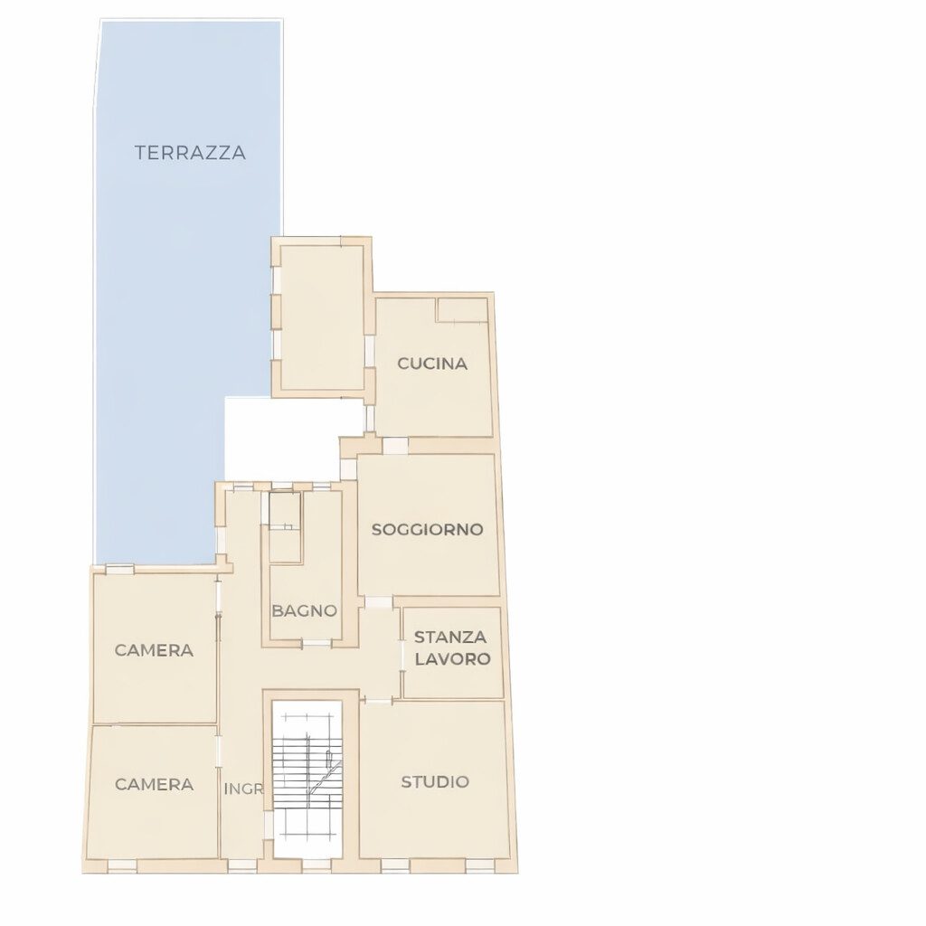 L’immobile è completato da una splendida terrazza abitabile e riservata di circa 83 mq, uno spazio raro per la zona centrale, ideale per pranzi all’aperto, momenti di relax o per creare una vera e propria area living esterna.