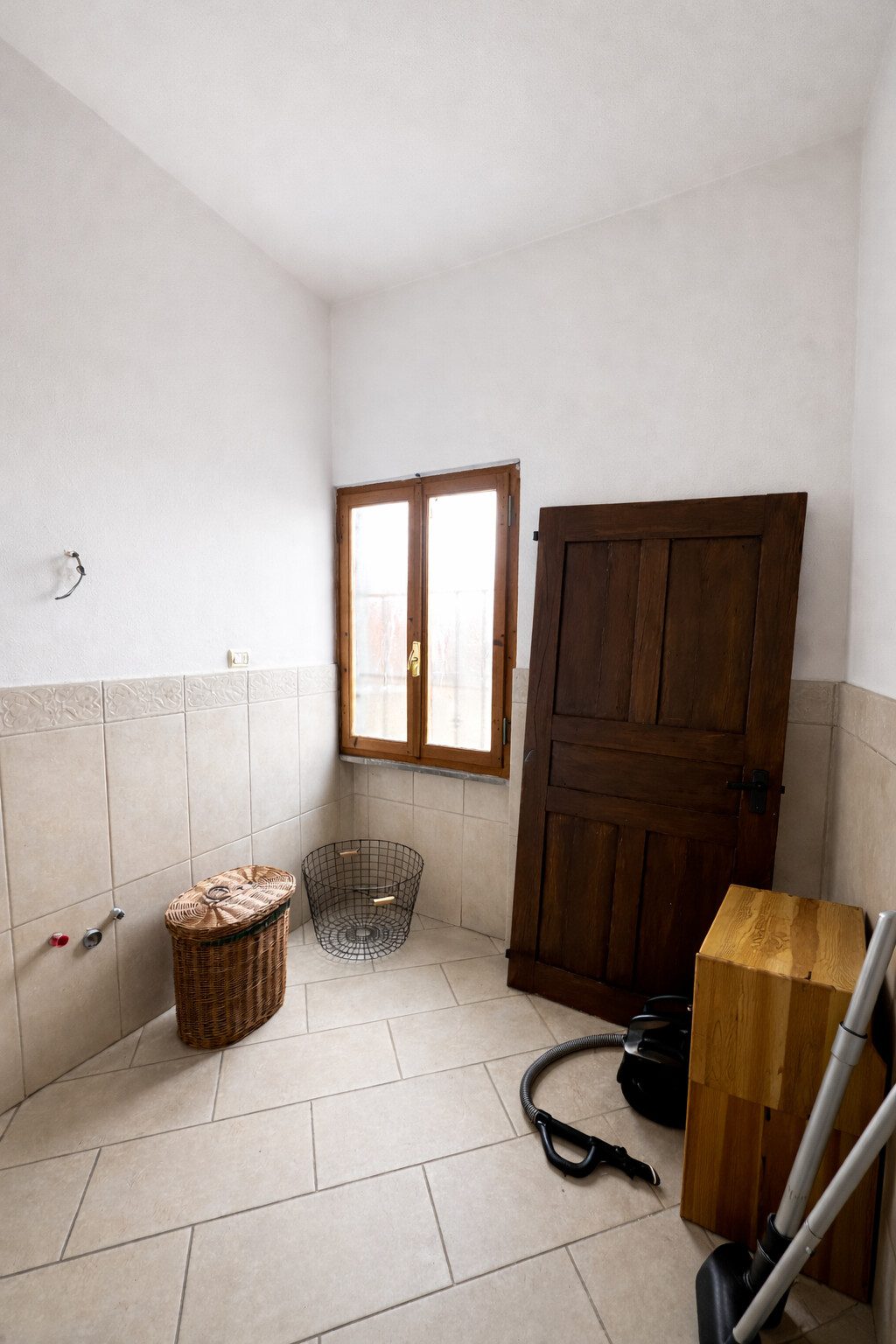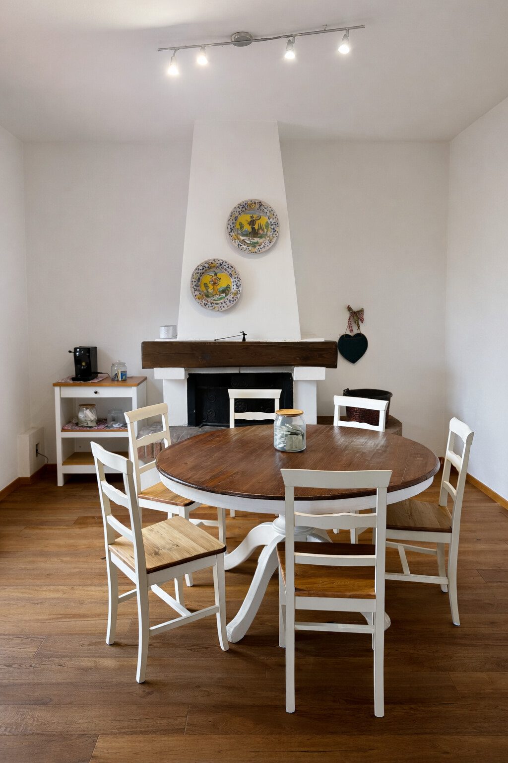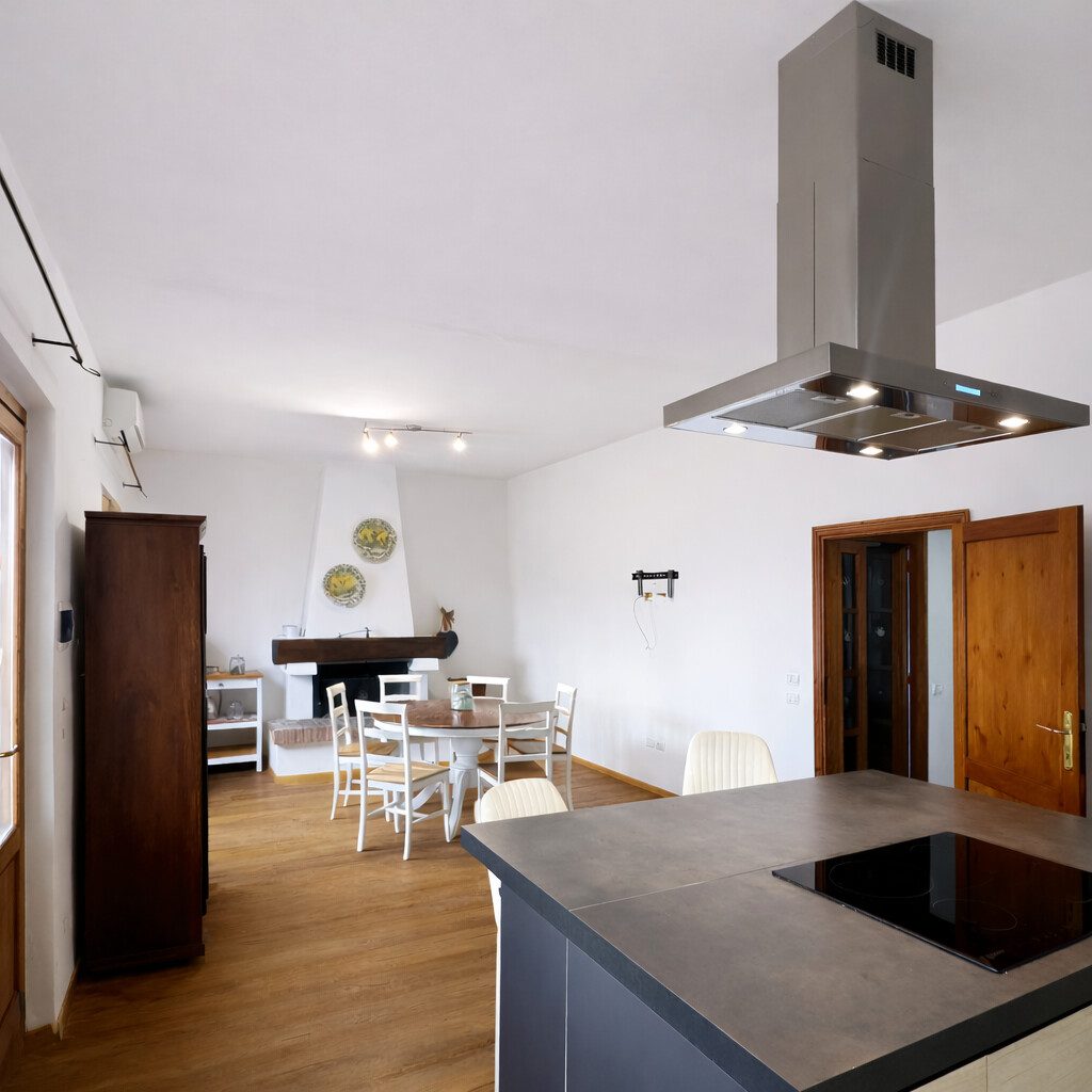 La zona giorno è composta da un soggiorno di generose dimensioni, con accesso diretto a una terrazza. La cucina abitabile, separata, è dotata di camino e presenta due finestre oltre a una porta-finestra che conduce a una terrazza coperta con travi in legno.